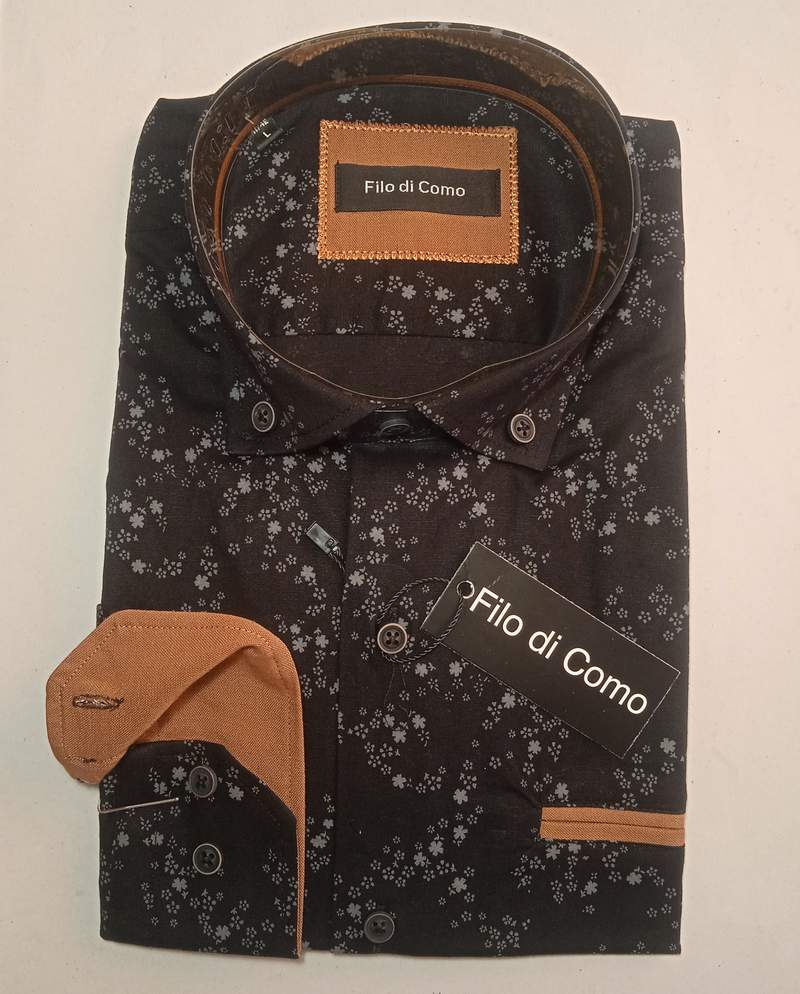 Πουκάμισο μαύρο με σχέδιο γκρι & λεπτομέρειες camel
